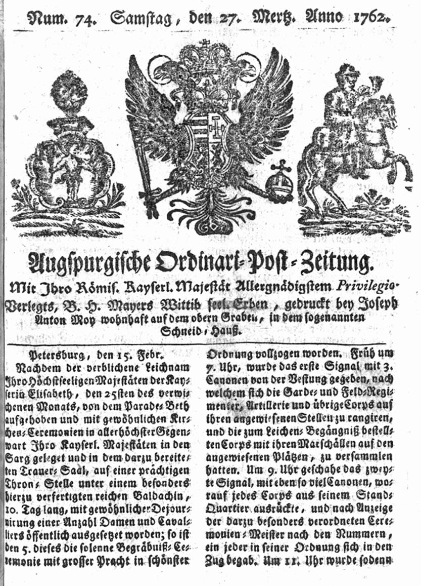 Titelblatt der "Augspurgische Ordinari-Post-Zeitung" vom 27. März 1762. Gegenstand der Berichterstattung sind die Trauerfeierlichkeiten für Zarin Elisabeth von Rußland (1709-1762, reg.1741-1762)