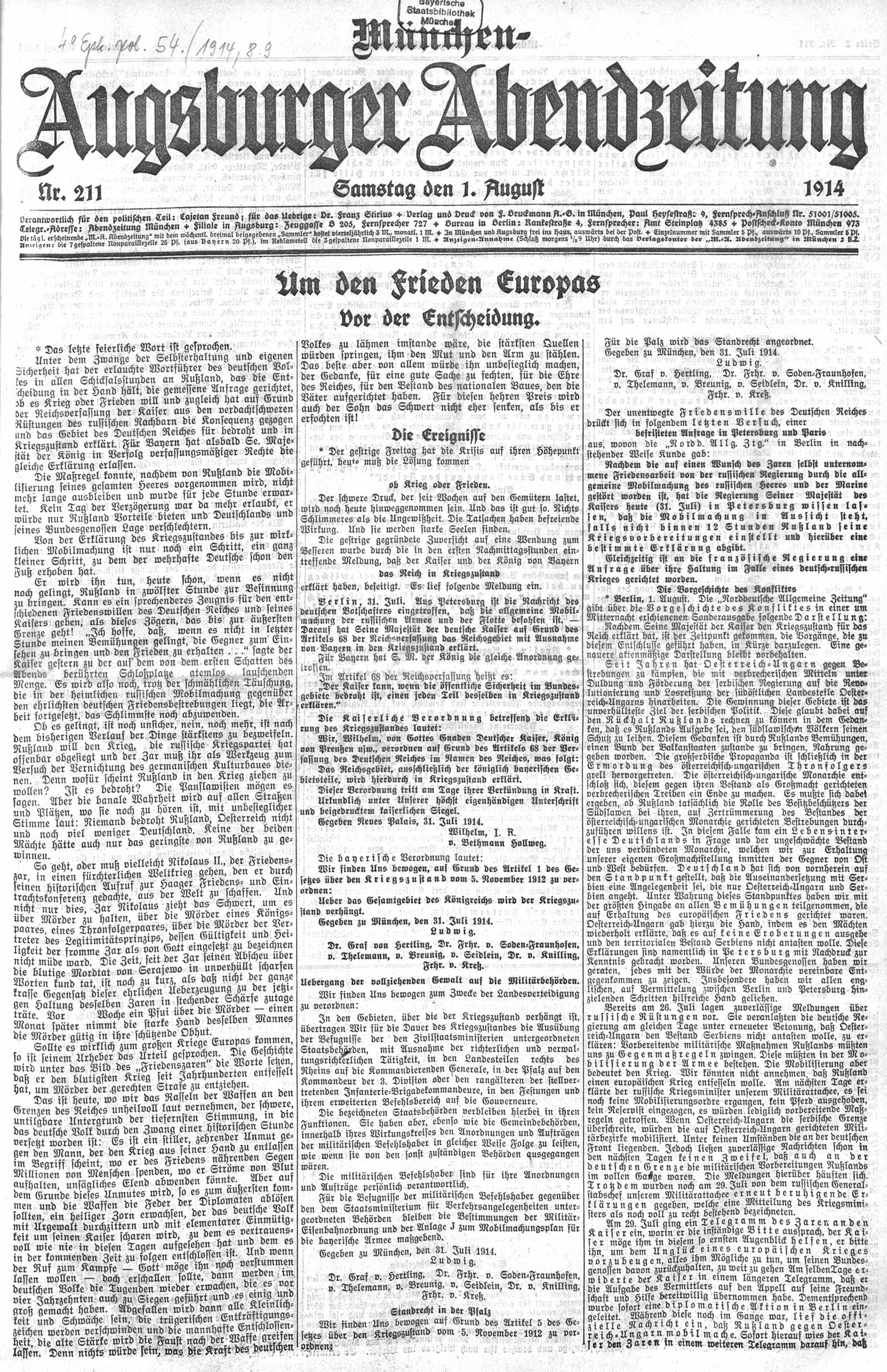 Titelseite der München-Augsburger-Abendzeitung vom 1. August 1914. Gegenstand der Berichterstattung ist der Ausbruch des ErstenWeltkriegs