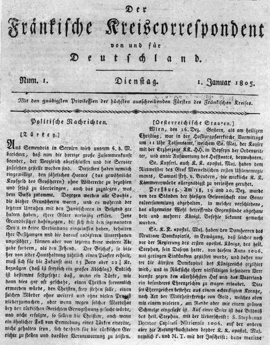 "Der fränkische Kreiscorrespondent von und für Deutschland". Titelblatt der Ausgabe vom 1. Januar 1805. (aus: 25 Jahre gewerblicher Arbeit im Hause Erich Spandel, Nürnberg. 1888-1913. Gedenkschrift, Nürnberg 1913, 26)