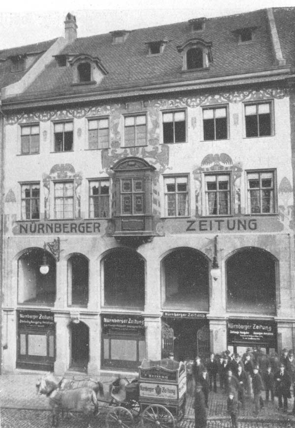 Verlagsgebäude der Nürnberger Zeitung am Hauptmarkt 4 in Nürnberg. (aus: 25 Jahre gewerblicher Arbeit im Hause Erich Spandel, Nürnberg. 1888-1913. Gedenkschrift, Nürnberg 1913, 6)