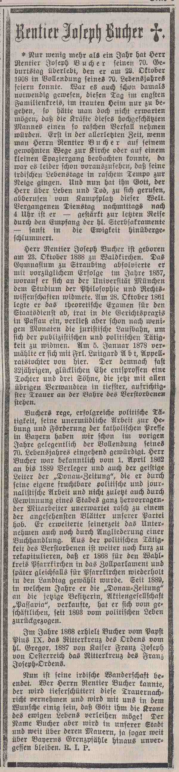Nachruf auf den langjährigen Eigentümer Joseph Bucher (1838-1909) in der Donau-Zeitung vom 9. Dezember 1909.