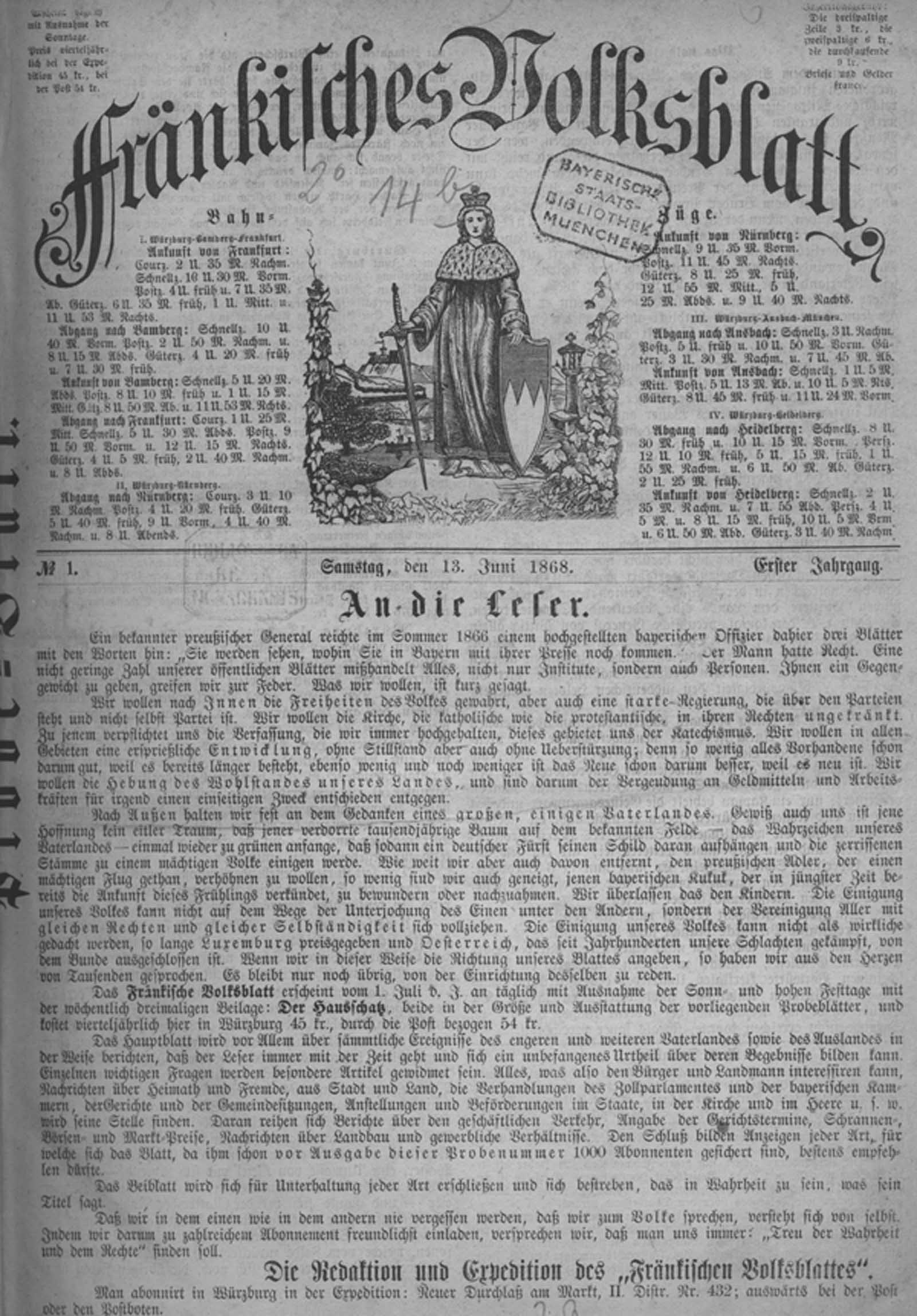 Erste Ausgabe des Fränkischen Volksblatts vom 13 Juni 1868 mit einem Editorial zur politischen Ausrichtung des Blattes Die Frau, die am Titelblatt Franken symbolisiert, hält in ihrer rechten Hand das Fränkische Herzogsschwert, in ihrer linken ein Wappenschild mit dem FränkischenRechen
