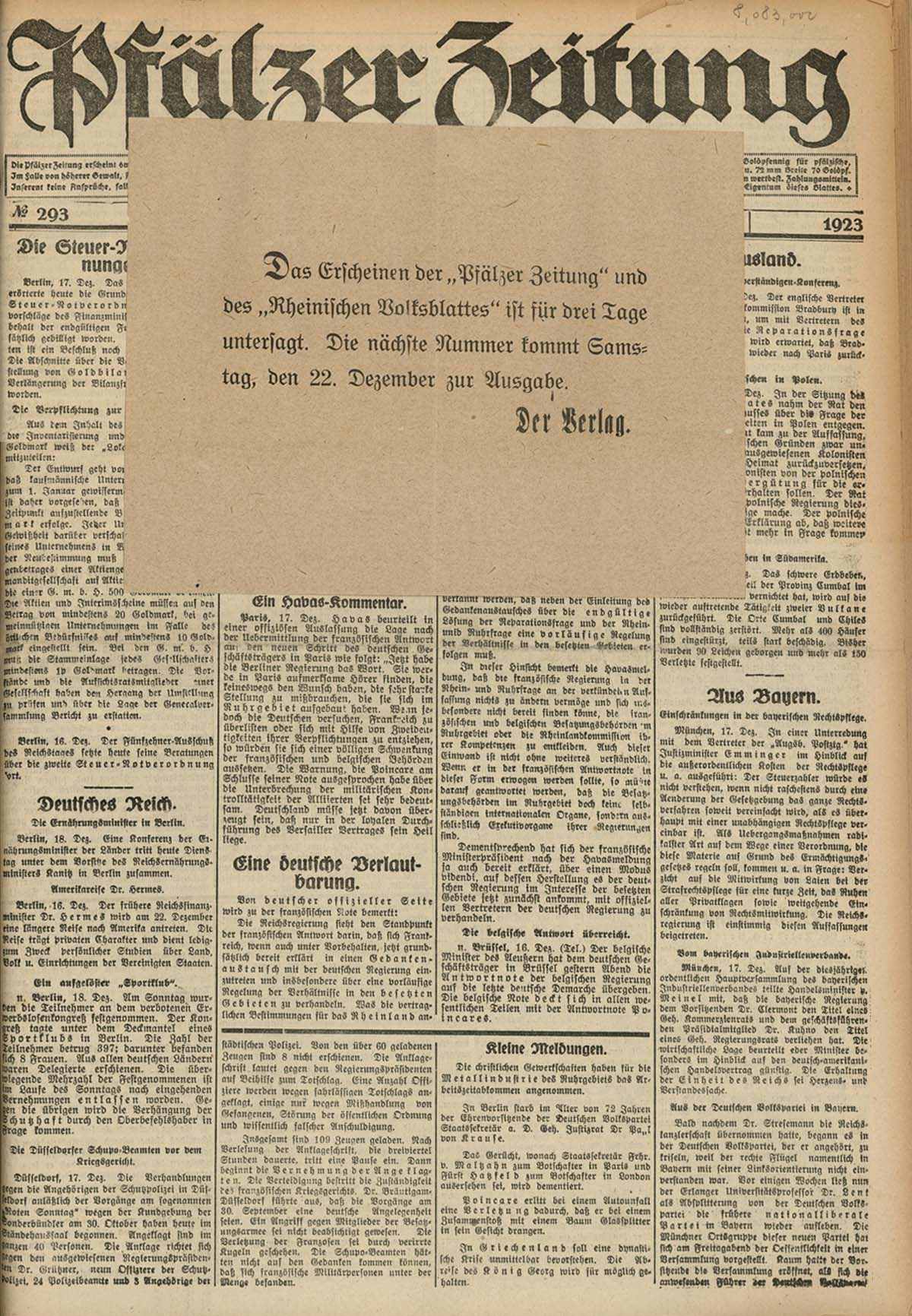 Pfälzer Zeitung vom 18. Dezember 1923 mit Verlagshinweis auf das dreitägige Verbot der Zeitung.