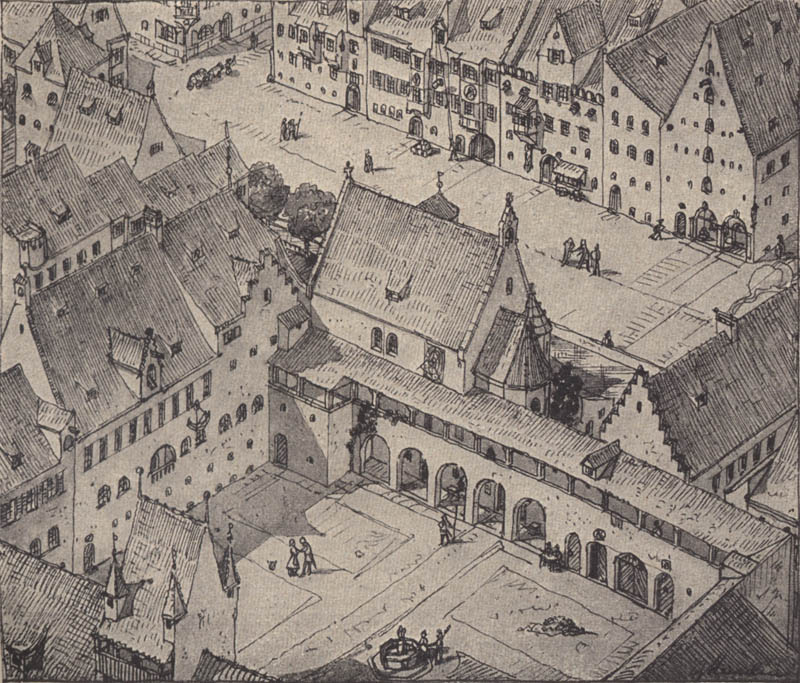 Rekonstruktion: Die Zeichnung zeigt den Alten Hof in München mit der Lorenzkapelle um 1570. (in: Das Bayerland. Illustrierte Wochenschrift für Bayerns Land und Volk, 25. Jg., Nummer 19, 7. Februar 1914)
