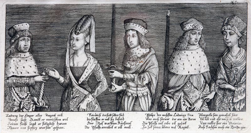 Kupferstich von Johann Georg Wisger; dargestellt sind von links nach rechts: Kurfürst Ludwig IV. von der Pfalz (reg. 1437-1449) und seine Gemahlin Margarete (gest. 1479), Kurfürst Friedrich I. (reg. 1451-1476) sowie das Brautpaar der Amberger Hochzeit, Kurfürst Philipp von der Pfalz (reg. 1476-1508) und seine Gemahlin Margarete (1456-1501). (Stadtmuseum Amberg, Foto: Wolfgang Steinbacher)