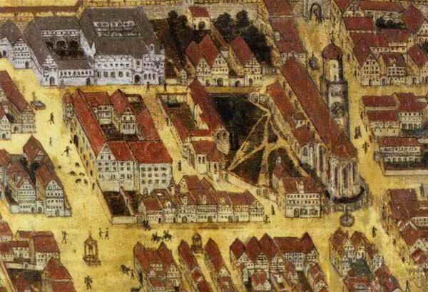 Ausschnitt aus der Stadtansicht von Memmingen (ca. 1650) von Sebastian Dochtermann (1585-1660). Der Ausschnitt zeigt die Stadtpfarrkirche St. Martin, deren Patronat seit 1214 den Antonitern zustand, sowie die ehemalige Antoniterniederlassung (großes weißes Gebäude). (Stadtmuseum Memmingen)