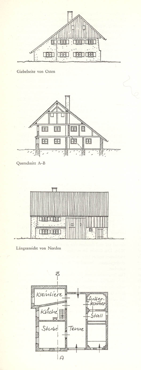 Abbildung eines Staudenhauses in Schwabmünchen (Lkr. Augsburg). (aus: Heinrich Götzger/Helmut Prechter, Das Bauernhaus in Bayern, Band I: Regierungsbezirk Schwaben [Studien zur Geschichte Bayerisch-Schwabens Band 5], München 1960, 78)