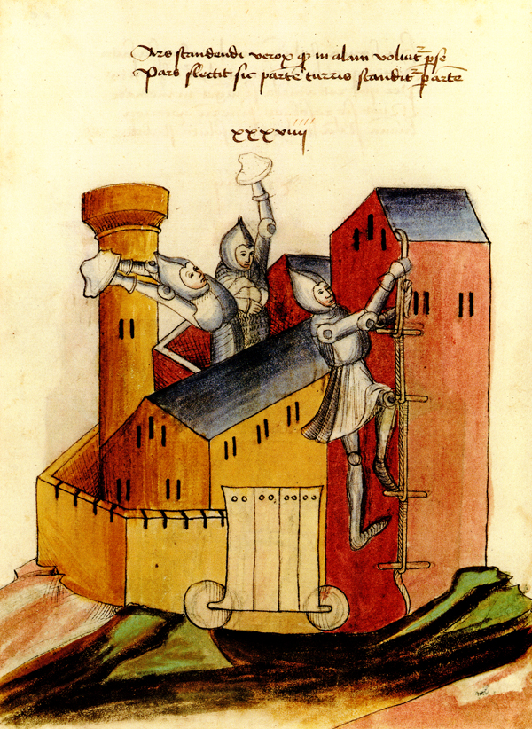 Einsteigen in eine Burg und Abwehr durch Steinwürfe. Darstellung aus Konrad Kyesers "Bellifortis" über spätmittelalterliche Kriegstechnik. (BSB Clm 30150, fol. 22')