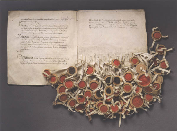 Konföderation der evangelischen Stände Böhmens, Mährens, Schlesiens und der Ober– und Niederlausitz mit den evangelischen Ständen Österreichs unter der Enns, Confoederatio Bohemica, Prag 16.8.1619. Pergamentlibell mit 65 anhängenden Siegeln. (Österreichisches Staatsarchiv, Urkunde AUR 1619 VIII 16)