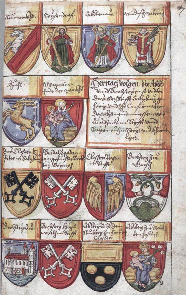 Landtafel des Erzstifts Salzburg, Anfang 17. Jahrhundert; Die Märkte des Erstifts Salzburg: Neumarckht, Teysendorf, Abbtenaw, Windisch Materey, Khuchl, Wagrain. Ende der Märckht. Abt- und Propsteien, die im Stift und Bayern, in Steiermark und Kärnten liegen und ihre Bestätigung vom Erzstift erhalten: S. Peter in Salzburg, Berdelßgaden, (Michael)Peyrn, Garsch, Aw, Höglwörth, Nunberg, Raittenhaslach. (Landesarchiv Troppau/Zemský Archiv v Opavě, Handschriftensammlung 1007)