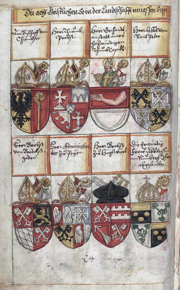 Landtafel des Erzstifts Salzburg, Anfang 17. Jahrhundert; "Die vier [Erb-]Ämbter": Nußdorf, Khuen, Thurn, Thanhausen. (Landesarchiv Troppau/Zemský Archiv v Opavě, Handschriftensammlung 1007)