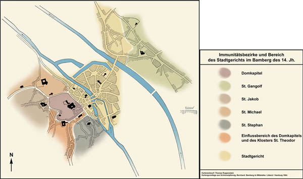 Das Stadtgericht Bamberg und die Immunitätsbezirke im 14 Jahrhundert [Stadtarchiv Bamberg, Kartenentwurf: Thomas Ruppenstein, Kartengrundlage aus Bernd Schimmelpfennig, Bamberg im Mittelalter, Lübeck/Hamburg1964]
