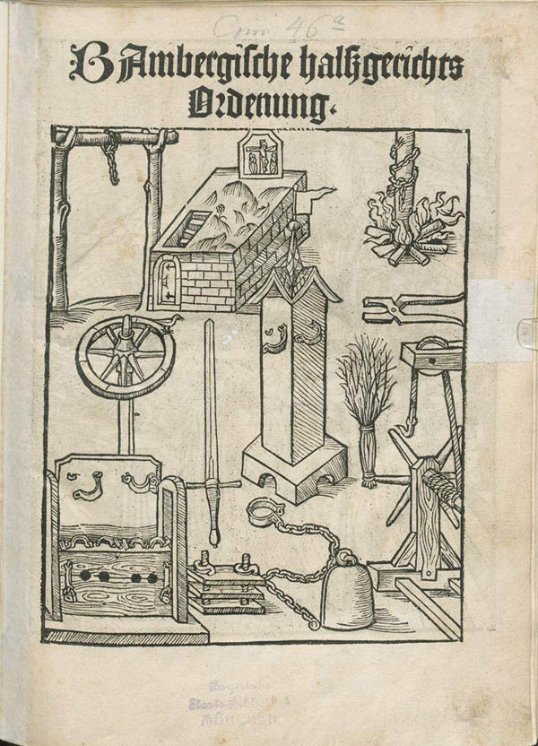Bambergische Halsgerichtsordnung. Titelblatt der Ausgabe Mainz 1508. Das Titelblatt zeigt Hinrichtungs- und Folterinstrumente. (Bayerische Staatsbibliothek, Rar. 2137)