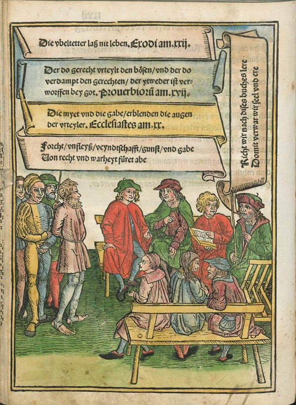 Gerichtsszene aus der Bambergischen Halsgerichtsordnung. Kolorierter Holzschnitt aus der Ausgabe von 1507. (Bayerische Staatsbibliothek, Rar. 466)
