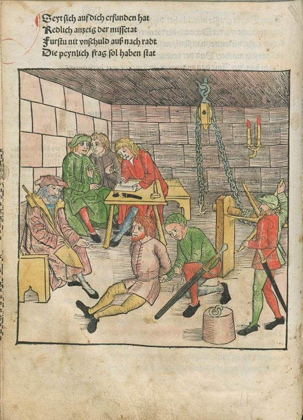Darstellung zur peinlichen Befragung (Folter) aus der Bambergischen Halsgerichtsordnung. Kolorierter Holzschnitt aus der Ausgabe von 1507. (Bayerische Staatsbibliothek, Rar. 466)