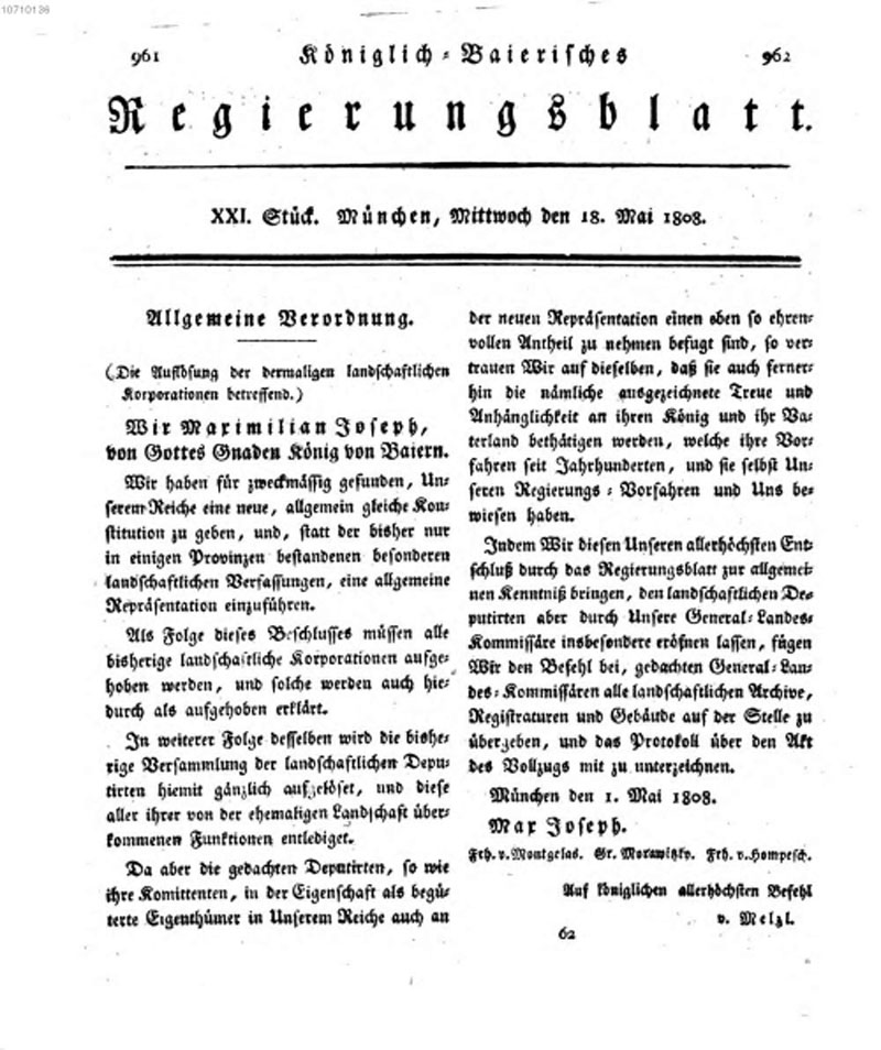 Aufhebung aller landschaftlicher Korporationen des Königreichs Bayern, 1. Mai 1808. Aus: Königlich-Baierisches Regierungsblatt, 1808, 961f. (Bayerische Staatsbibliothek, 4 Bavar. 3021 b-1808)