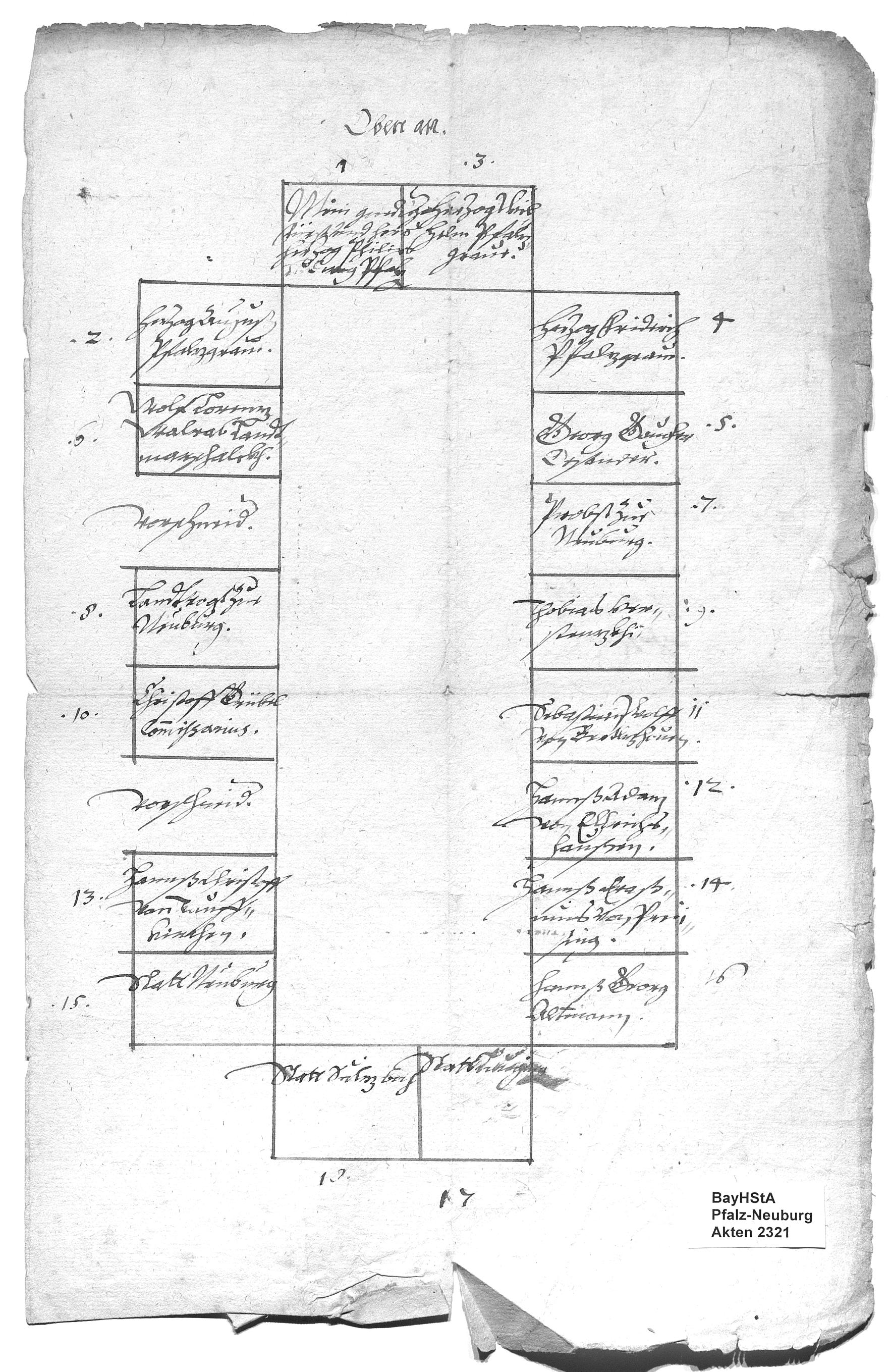Sitzordnung an der fürstlichen Tafel von 1604-1611. (Bayerisches Hauptstaatsarchiv, Pfalz-Neuburg Akten 2321)