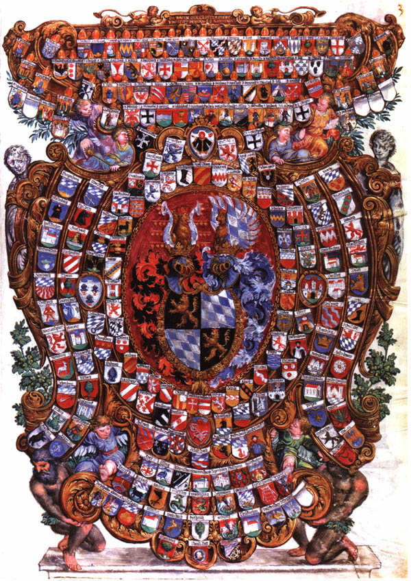 Landtafel des Herzogtums Bayern von Hans Mielich (1516-1573). Um das herzogliche Wappen herum sind die Wappen von Adel, Prälaten sowie Städten und Märkten angeordnet. (Bayerische Staatsbibliothek)
