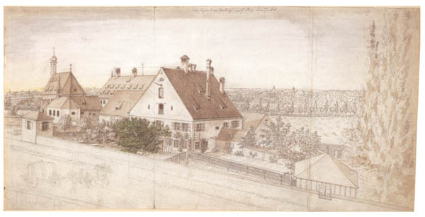 Das Spital am Münchner Gasteig. Federzeichnung von Carl August Lebschée (1800-1877). Im 13. Jahrhundert als Leprosenhaus entstanden, wurden im Spital in späteren Jahrhunderten andere Kranke versorgt. Die Spitalgebäude wurden 1863 abgebrochen. (Münchner Stadtmuseum, Sammlung Graphik/Plakat/Gemälde, Inv.-Nr G Z 1074)