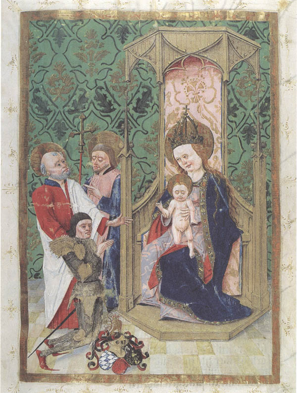 Pfalzgraf und Kurfürst Friedrich I. der Siegreiche von der Pfalz huldigt, von Petrus geleitet, der Muttergottes mit dem Kind. Neben Petrus steht der Apostel Philippus, der Namenspatron von Friedrichs Mündel und Nachfolger. Die Miniatur stammt ebenfalls aus dem Lehenbuch von 1471. Aufgrund der Tatsache, dass Pfalzgraf Friedrich mit Hilfe der Adoption seines Neffen regierte und dies vom Kaiser nicht anerkannt wurde, erhält das Lehenbuch auch eine legitimatorische Funktion. (aus: Volker Rödel [Hg.], Der Griff nach der Krone. Die Pfalzgrafschaft bei Rhein im Mittelalter. Begleitpublikation zur Ausstellung der Staatlichen Schlösser und Gärten Baden-Württemberg und des Generallandesarchivs Karlsruhe [Schätze aus unseren Schlössern 4], Regensburg 2000, Kat. Nr. 85 b, S. 242; [Original: Generallandesarchiv Karlsruhe, 67/1057, fol. 42r])
