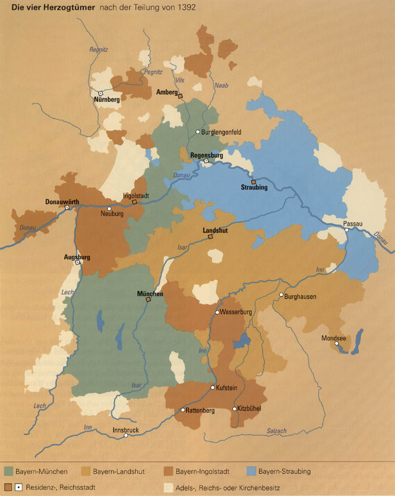 Die vier bayerischen Herzogtümer nach der Teilung von 1392. (in: Suzanne Bäumler/Evamaria Brockhoff/Michael Henker [Hg.], Von Kaisers Gnaden. 500 Jahre Pfalz-Neuburg [Veröffentlichungen zur Bayerischen Geschichte und Kultur 50], Augsburg 2005, 37)