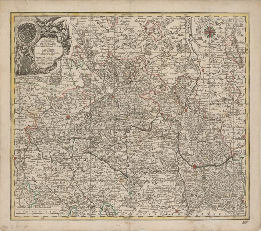 Unterland des Fürstentums Brandenburg-Bayreuth, Kupferstich von Matthäus Seutter (1678-1757), nach dem handgezeichneten Entwurf von Johann Georg Dülp, Augsburg 1744. (Bayerische Staatsbibliothek, Kartensammlung, Mapp. XI,331 dc)