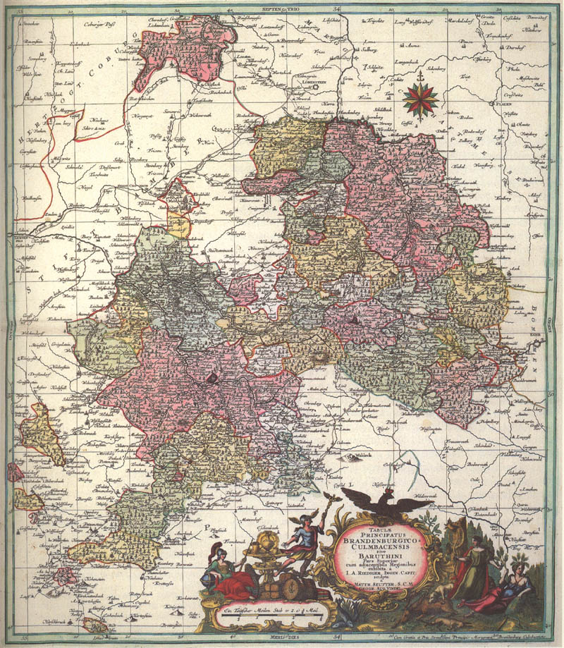 Oberland des Fürstentums Bayreuth, Kupferstich von Matthäus Seutter (1678-1757) nach dem handgezeichneten Original von Johann Adam Riediger (1680-1756), Augsburg, um 1750. (Bayerische Staatsbibliothek München, Kartensammlung, 2 Mapp. 8,3-60)