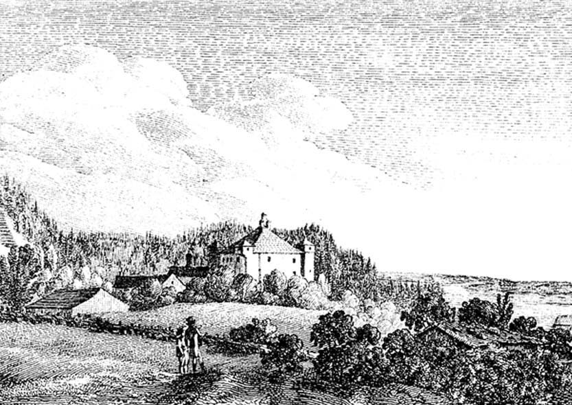 Hofmarkschloss Possenhofen - Kupferstich um 1800, Künstler unbekannt. (Abb. aus: Lorenz Westenrieder, Der Würm- oder Starenbergersee, und die umliegende Gegend, 2. Aufl. München 1811, 40)