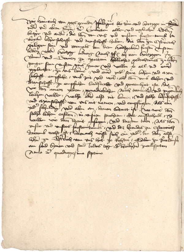 Aufforderung Herzog Heinrichs von Bayern-Landshut (reg. 1393-1450) an Lehenbesitzer in Österreich zur Empfangnahme ihrer Lehen, 23. Oktober 1447. In dem Text wird dargelegt, dass das Lehenswesen nach Landrecht und Gewohnheitsrecht praktiziert wurde. (BayHStA, Neuburger Kopialbücher 8, fol. 315v)