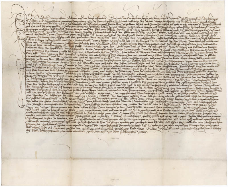Andre Schwarzenstein, Pfleger von Vilshofen, nennt die ihm von Herzog Heinrich von Bayern-Landshut (reg. 1393-1450) verliehenen Lehen, die er zuvor Georg Kirchbeck abgekauft hat und zukünftig als Afterlehen weiterverleihen will. (BayHStA, GU Vilshofen 458, 28. Januar 1450, Lehenrevers)