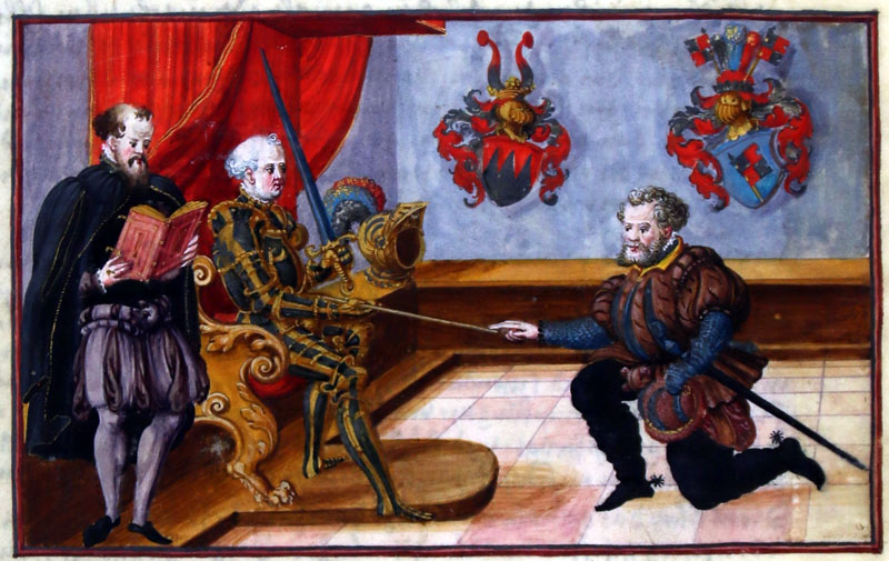 Belehnung mit dem Blutbann, 2. Hälfte des 16. Jahrhunderts. Der Bischof, hier mit dem Schwert in seiner Funktion als Herzog gekennzeichnet, berührt die Schwurhand des Lehensmanns mit dem Stab; ein Mitarbeiter der Kanzlei liest dem Vasallen den Text des Lehnseides vor. (Staatsarchiv Würzburg, Standbuch 884)