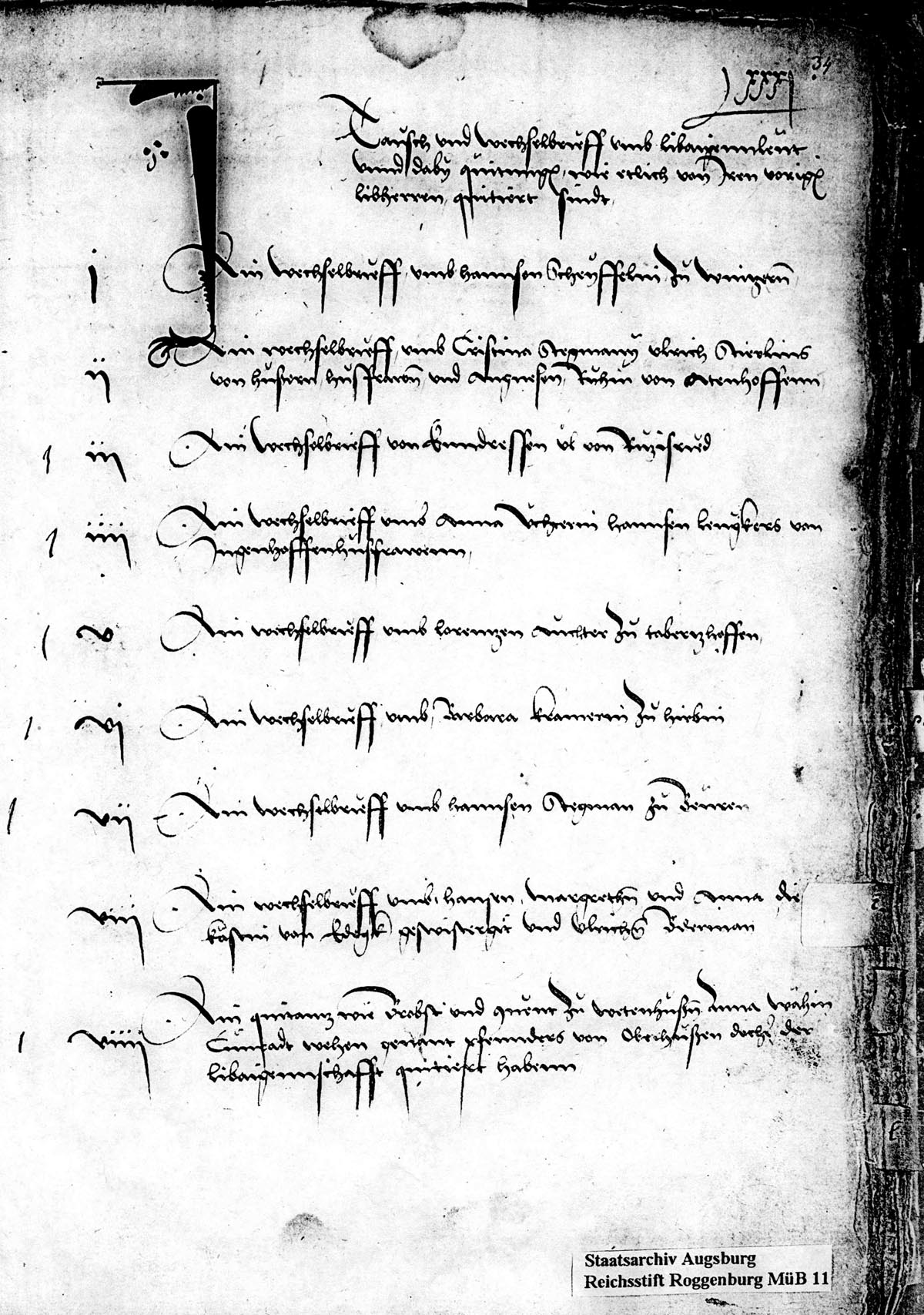 Reichsstift Roggenburg: Register über vertauschte Leibeigene, Ende 15 Jahrhundert [StAA, Reichsstift Roggenburg, MüB 11, fol 34r-35r, hier34r]