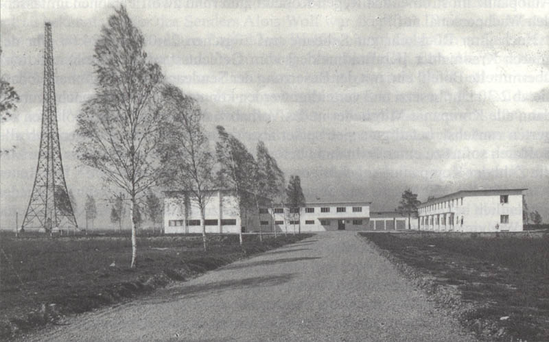 Großsender Ismaning, Holzsendeturm und Sendegebäude, 1932. (BR, Historisches Archiv/Marga Troll)