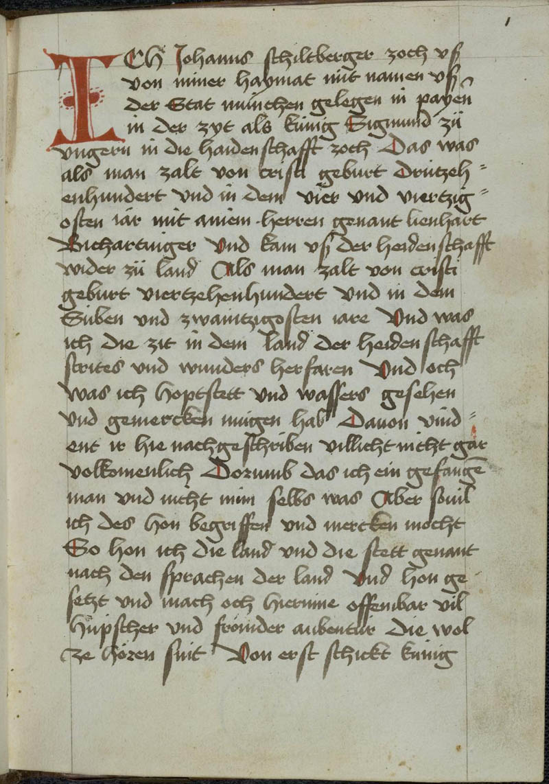 Johannes Schiltberger, Reisebuch, um 1480. (Universitätsbibliothek Heidelberg, Cod. Pal. germ. 216, 1r)
