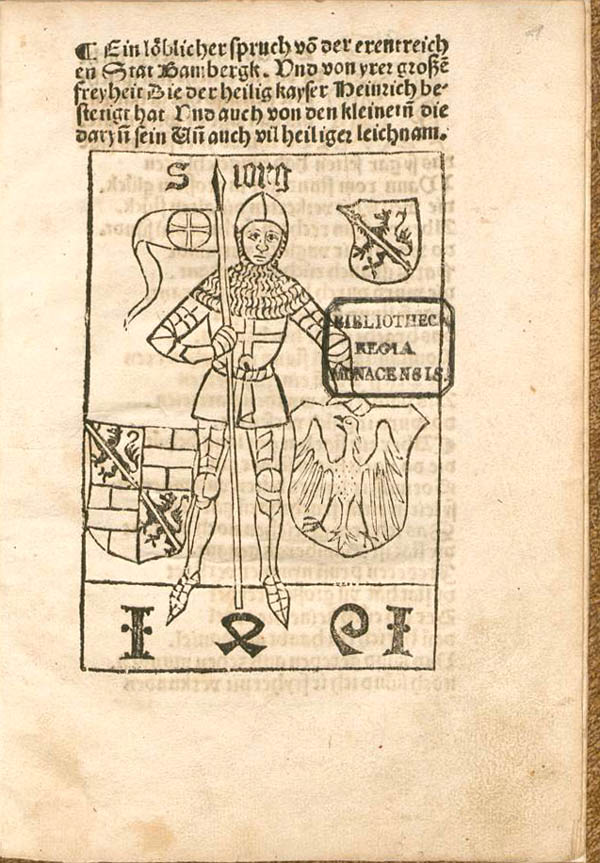Titelblatt von Hans Rosenplüt, Ein loeblicher Spruch von der erentreichen Stadt Bambergk, Bamberg, 1491. (Bayerische Staatsbibliothek, 4 Inc.s.a. 1692 m)