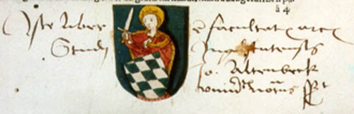 Gemaltes Exlibris der Artistenfakultät der Universität Ingolstadt, Ende 15. Jahrhundert. (Universitätsbibliothek München)