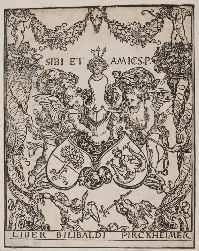 Exlibris des Humanisten Willbald Pirckheimer (1470-1530) mit der Devise "Sibi et amicis", Holzschnitt von Albrecht Dürer, um 1503. (Herzog August Bibliothek Wolfenbüttel, Berlepsch Exlibris T. I, S. 12, Nr. 5)