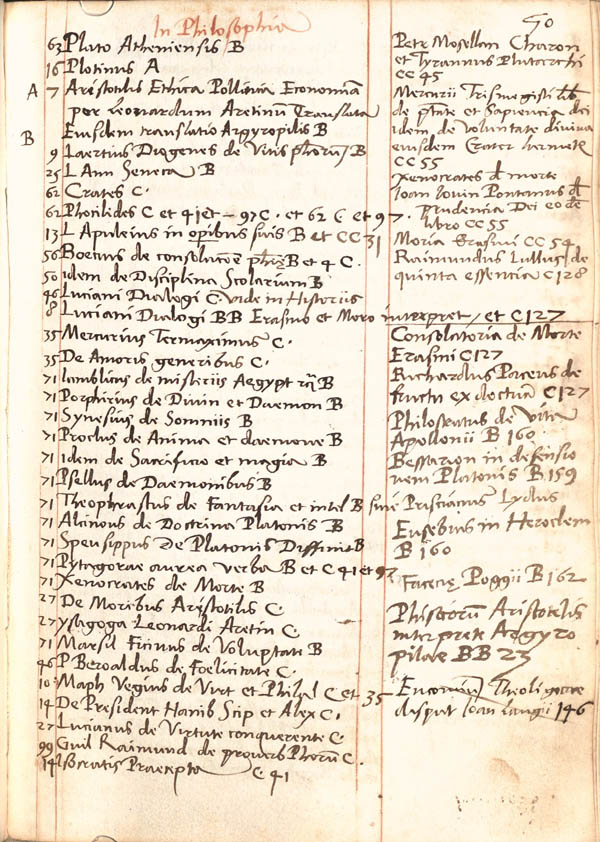 Bibliothek des Humanisten Konrad Peutinger (1465-1547): Katalog I, Fachkatalog: Beginn der Rubrik "In Philosophia". (Bayerische Staatsbibliothek, Clm 4021b, fol. 50r)