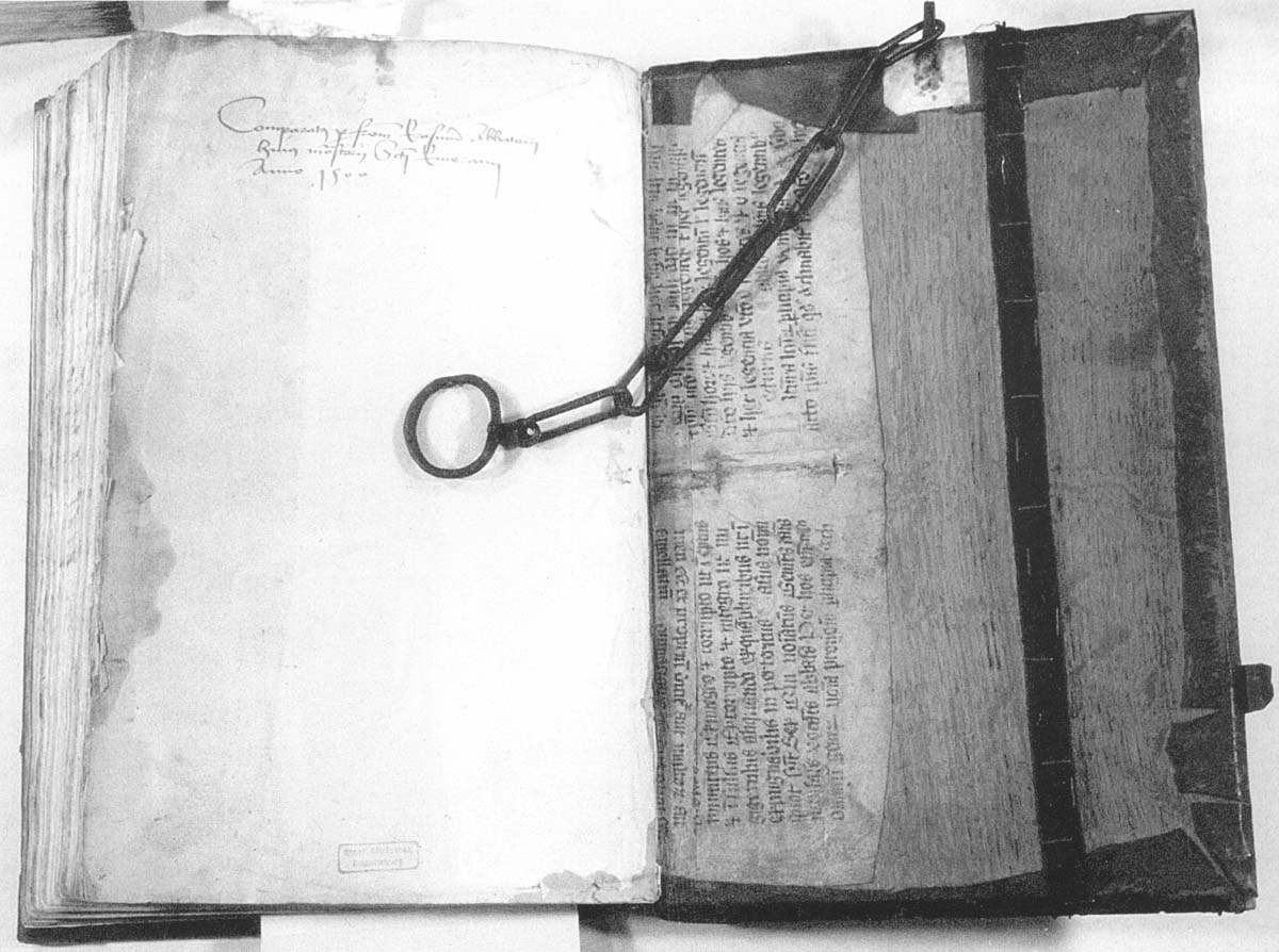 Kettenbuch aus dem Kloster St Emmeram [aus: Bücherschätze in Regensburg Frühe Drucke aus den Beständen der Staatlichen Bibliothek, Regensburg 1996,20]
