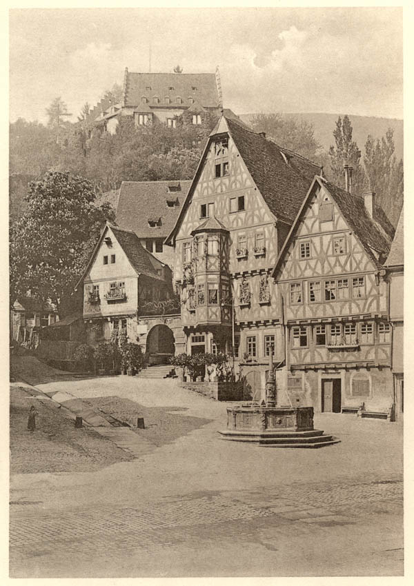 Der Marktplatz von Miltenberg Im Hintergrund die Burg Miltenberg [aus: Philipp Wirth, Kunstblätter aus Alt-Miltenberg, Miltenberg 1906, Tafel10]
