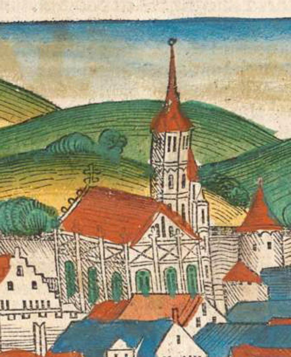 Die Marienkapelle in der Stadtansicht von Würzburg aus der Schedelschen Weltchronik. (Bayerische Staatsbibliothek, Rar. 287, fol. 160 [privates Exemplar des Hartmann Schedel])