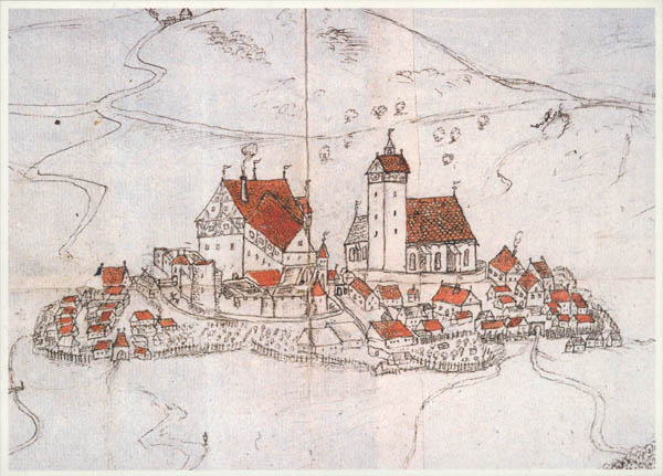 Darstellung von Ort und Burg Bibra (nach 1580), Ausschnitt aus einer Karte zu Jagdstreitigkeiten zwischen der Grafschaft Henneberg und den von Bibra. (Umschlagbild, aus: Werner Wagenhöfer, Die Bibra. Studien und Materialien zur Genealogie und zur Besitzgeschichte einer fränkischen Niederadelsfamilie im Spätmittelalter [Veröffentlichungen der Gesellschaft für fränkische Geschichte 9/45], Neustadt an der Aisch 1998; Original: Staatsarchiv Meiningen, GHA, Hennebergica aus Altenburg, Nr. 6)