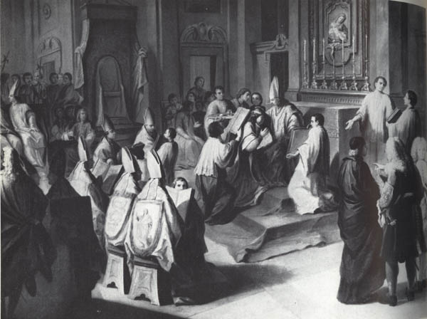 Bischofsweihe des Clemens August von Bayern, Erzbischof von Köln (1700-1761, Erzbischof 1723-1761) im Jahr 1727 in Viterbo. Gemälde von Francesco Fernandi, gen. Imperiali (1679-1740), im Schloss Augustusburg bei Brühl (Rhein-Erft-Kreis, Nordrhein-Westfalen). (Rheinisches Bildarchiv Köln)