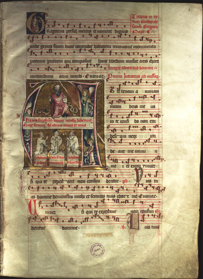 Erste notierte Seite des Moosburger Graduales mit den drei Urhebern der Handschrift. (Universitätsbibliothek München, Cim. 100, fol. 2)