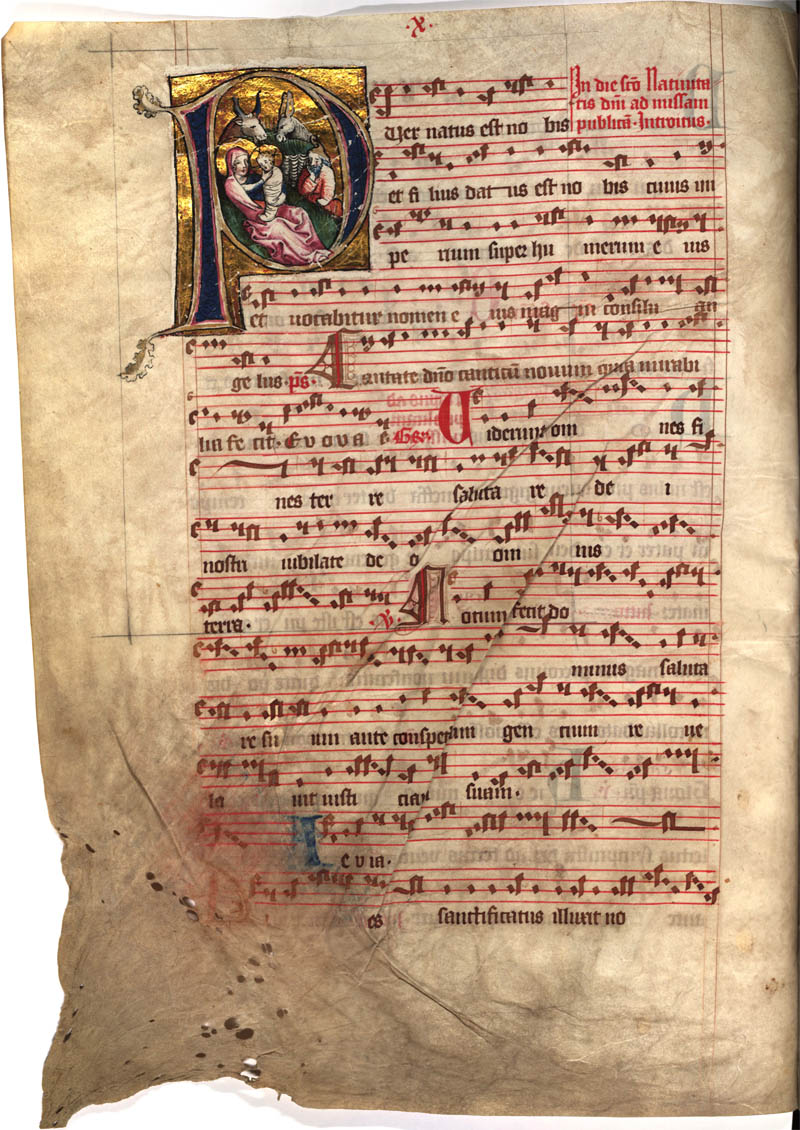Introitus zur Dritten Messe am Weihnachtstag "Puer natus est" im Moosburger Graduale mit einer Darstellung der Geburt Christi in der Initale. (Universitätsbibliothek München, Cim. 100, fol. 11')
