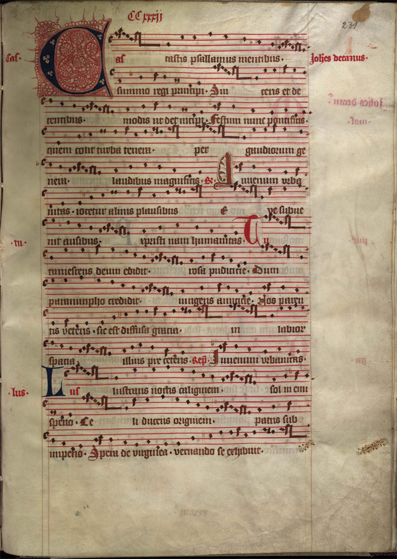 Cantio "Castis psallamus mentibus" von "Johannes decanus" (Johannes von Berchausen) mit Akrostichon "Castulus" im Moosburger Graduale. (Universitätsbibliothek München, Cim. 100, fol. 231)