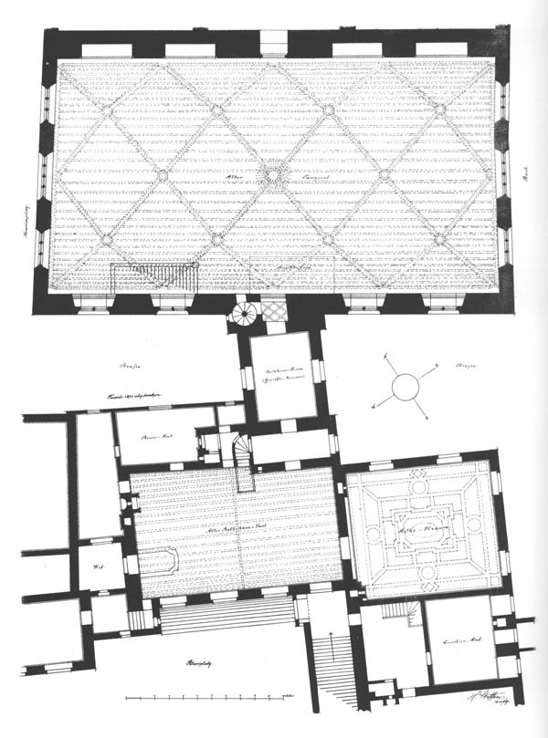 Das Alte Rathaus mit dem Tanzsaal (oben). Grundriss des Obergeschosses. (aus: Hugo Steffen, Baudenkmäler deutscher Vergangenheit 1.2, Berlin 1904)