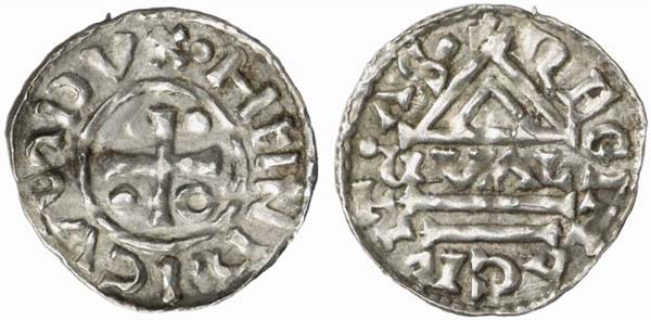 Herzogtum Bayern, Herzog Heinrich II., 2. Regierung (985-995). Denar, Münzstätte Regensburg, Münzmeister GVAL. Silber. Durchmesser ca. 23 mm; Gewicht 1,77 g. Kreuz mit Symbolen in den Winkeln/Kirchengebäude mit eingeschriebenem Münzmeisternamen. (Fritz Rudolf Künker GmbH & Co. KG, Foto: Lübke & Wiedemann, Auktion 143, 2008, Nr. 2192)