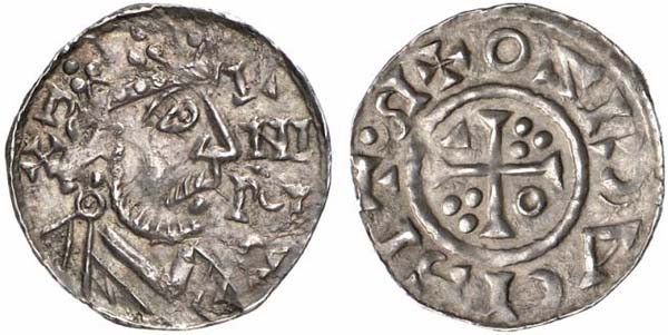 König Heinrich II. (reg. 1002-1024, Kaiser ab 1014) Denar, Münzstätte Regensburg, Münzmeister OZI. Silber. Durchmesser ca. 20 mm; Gewicht 1,45 g. Kopf des Königs nach rechts/Kreuz mit Symbolen in den Winkeln. (Fritz Rudolf Künker GmbH & Co. KG, Foto: Lübke & Wiedemann, Auktion 130, 2007, Nr. 2357)