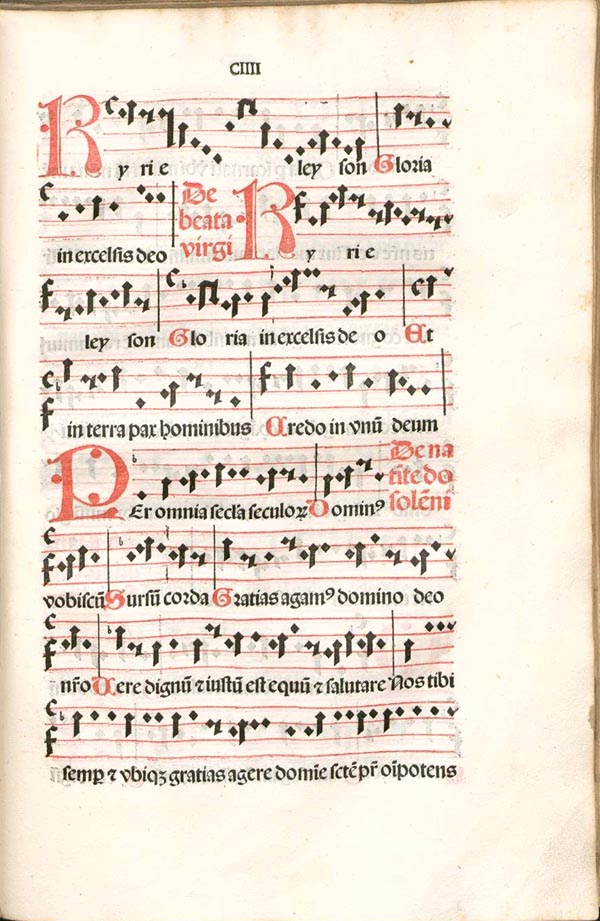 Früher Notendruck: Das Missale Augustanum von Erhard Radolt 1491, hier verschiedene Gesänge (Incipits von Kyrie, Gloria, Credo und andere Akklamationen). (BSB 2 Inc.c.a. 2589, fol. 104)